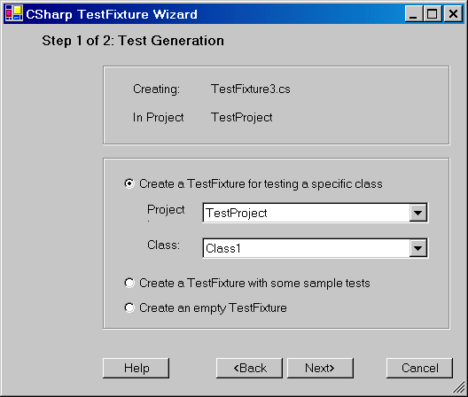 To make this version run, I created a file called CSharpAddTestFixtureWiz.vsz and put it in my VC#\CSharpProjectItems directory. It contains these two lines.